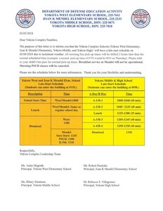 Due to the inclement weather today and in consideration of everyone’s safety, the Wing authorized an early release as of 2:30 p.m. today, Feb. 5. All non-essential personnel, to include active duty as well as U.S. and local national civilians are released from their work centers. For essential