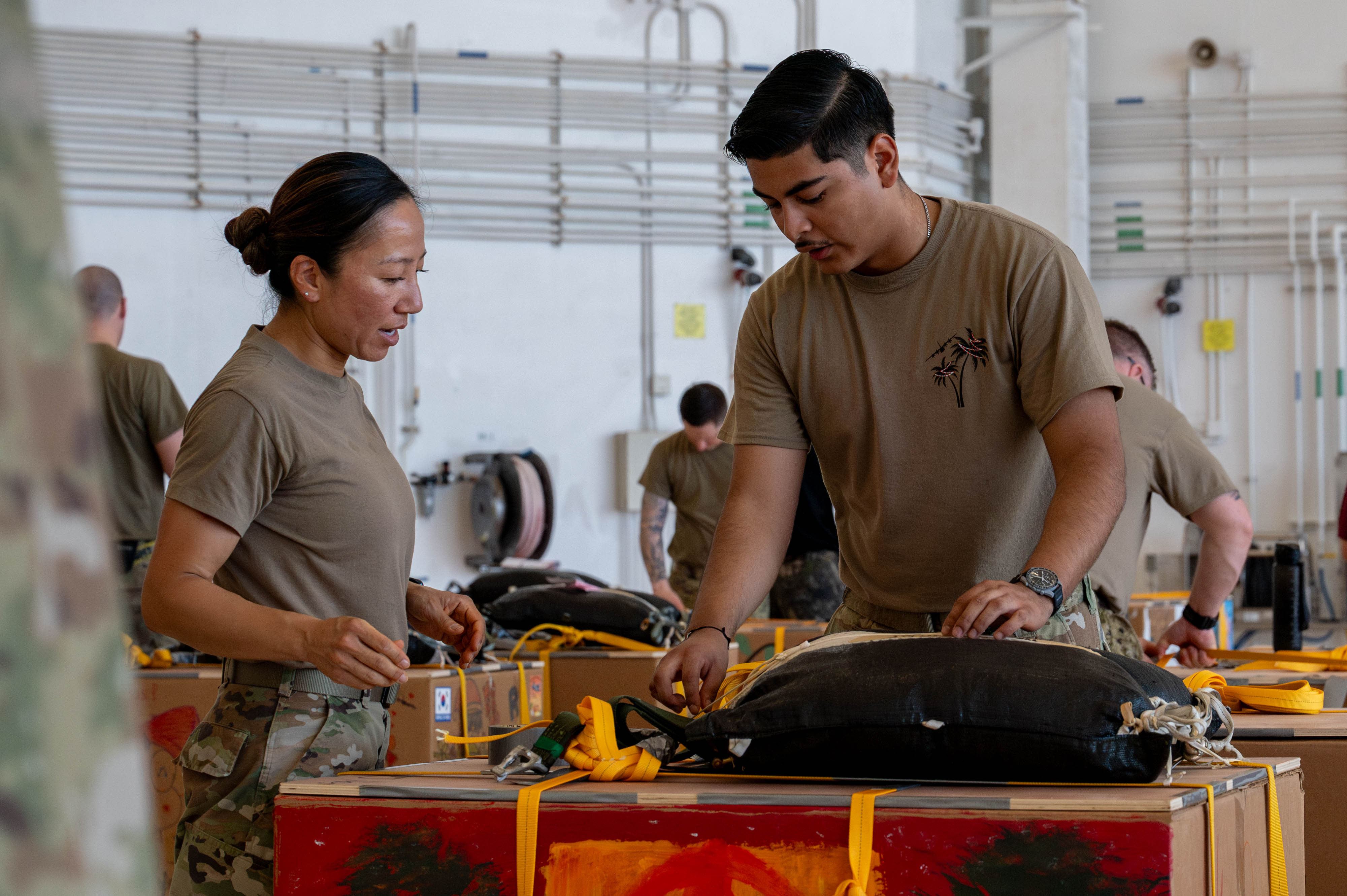 From left, U.S. Air Force Senior Airman Madison Sinclair, 374th Air Expeditionary Wing combat mobility flight combat mobility technician, and Lt. Col. Jae Kim, 374th Logistics Readiness Squadron commander, secure humanitarian aid bundles during Operation Christmas Drop 25 at Andersen Air Force Base, Guam, Dec. 14, 2025. Around 270 bundles were constructed, filled and loaded onto C-130 Hercules aircraft from the U.S., Canada, Japan and Republic of Korea air forces to be delivered to 59 remote islands in the Federated States of Micronesia, the Republic of the Marshall Islands and the Republic of Palau. This effort boasts the power of alliance, partnership in fostering stability and providing rapid airlift response in the region. (U.S. Air Force photo by Senior Airman Alexzandra Gracey)