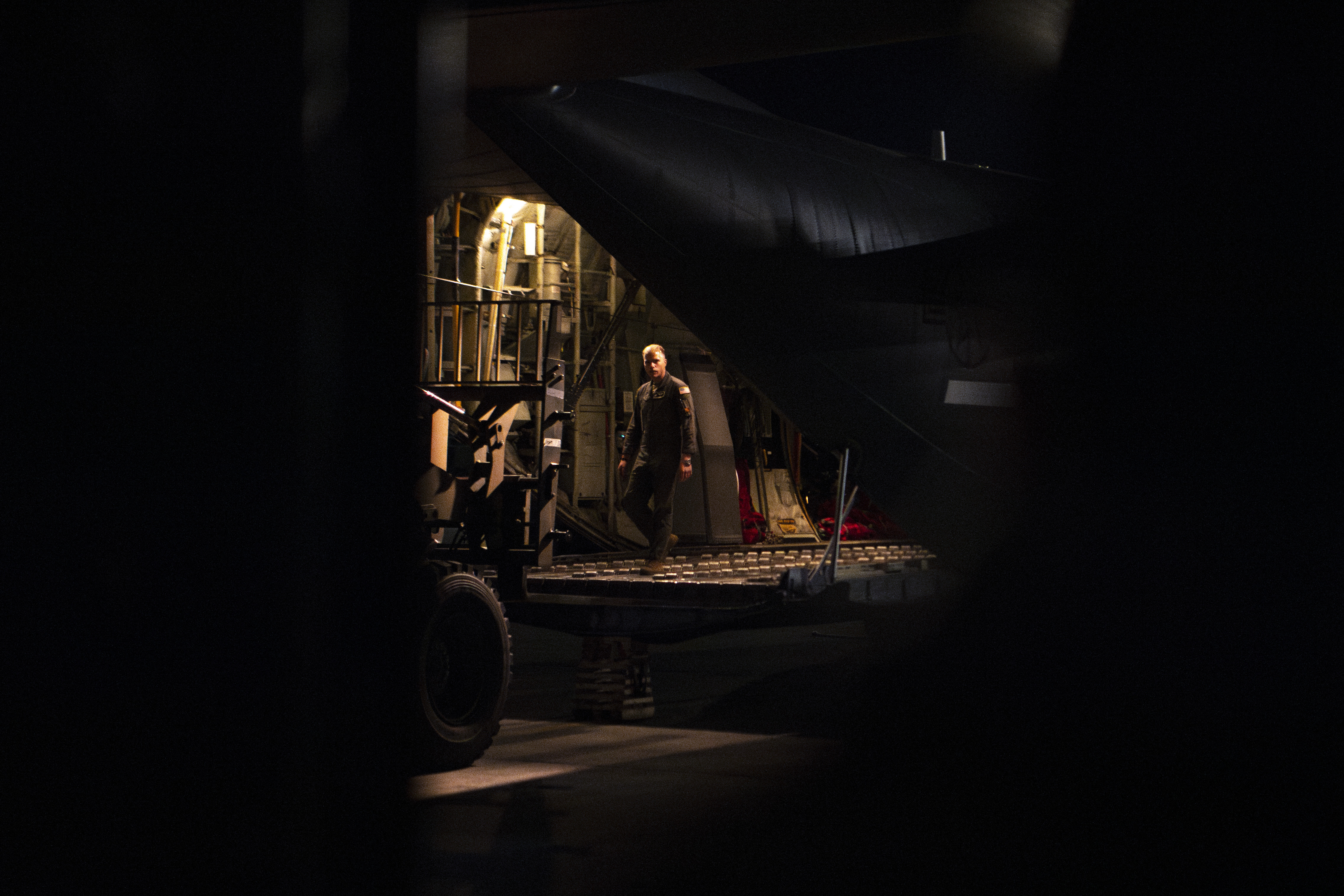U.S. Air Force Senior Airman Jordan Cusmano, 374th Logistics Readiness Squadron combat mobility technician, carries sleeper shoring onto a C-130J Super Hercules assigned to 36th Airlift Squadron in preparation of foreign disaster relief operations at Yokota Air Base, Japan, Nov. 10, 2025. At the request of the Government of the Philippines, the U.S. military is working alongside the Armed Forces of the Philippines to provide foreign disaster relief support to communities affected by consecutive Typhoons Kalmaegi (Tino) and Fung-Wong (Uwan), which caused extensive damage and tragic loss of life. The 374th Airlift Wing Logistics Quick Reaction Force supplied personnel and gear, including material-handling equipment, communication fly-away kits, flyaway security measures, to self-sustain aerial port and airlift operations. (U.S. Air Force photo by Staff Sgt. Spencer Tobler)