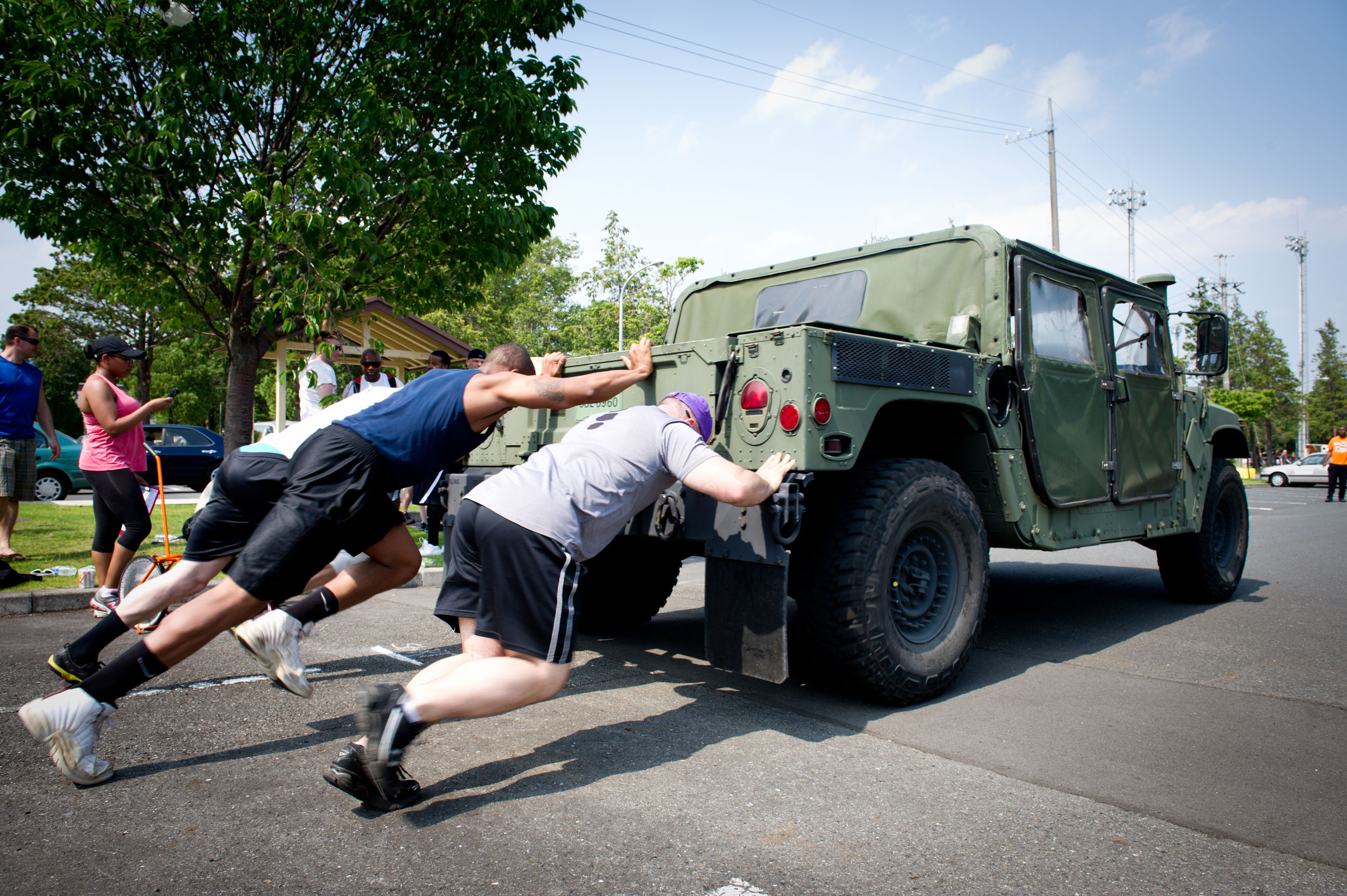 YOKOTA AIR BASE, Japan-- Airmen with the 730th Air Mobility Squadron push a Humvee during Airman Appreciation Day at Yokota Air Base, Japan, May 23, 2013. Sports representatives from various units around Yokota organized teams to compete in sports such as dodgeball, flag football, sumo, and volleyball. (U.S. Air Force photo by Staff Sgt. Stacy Moless/released)