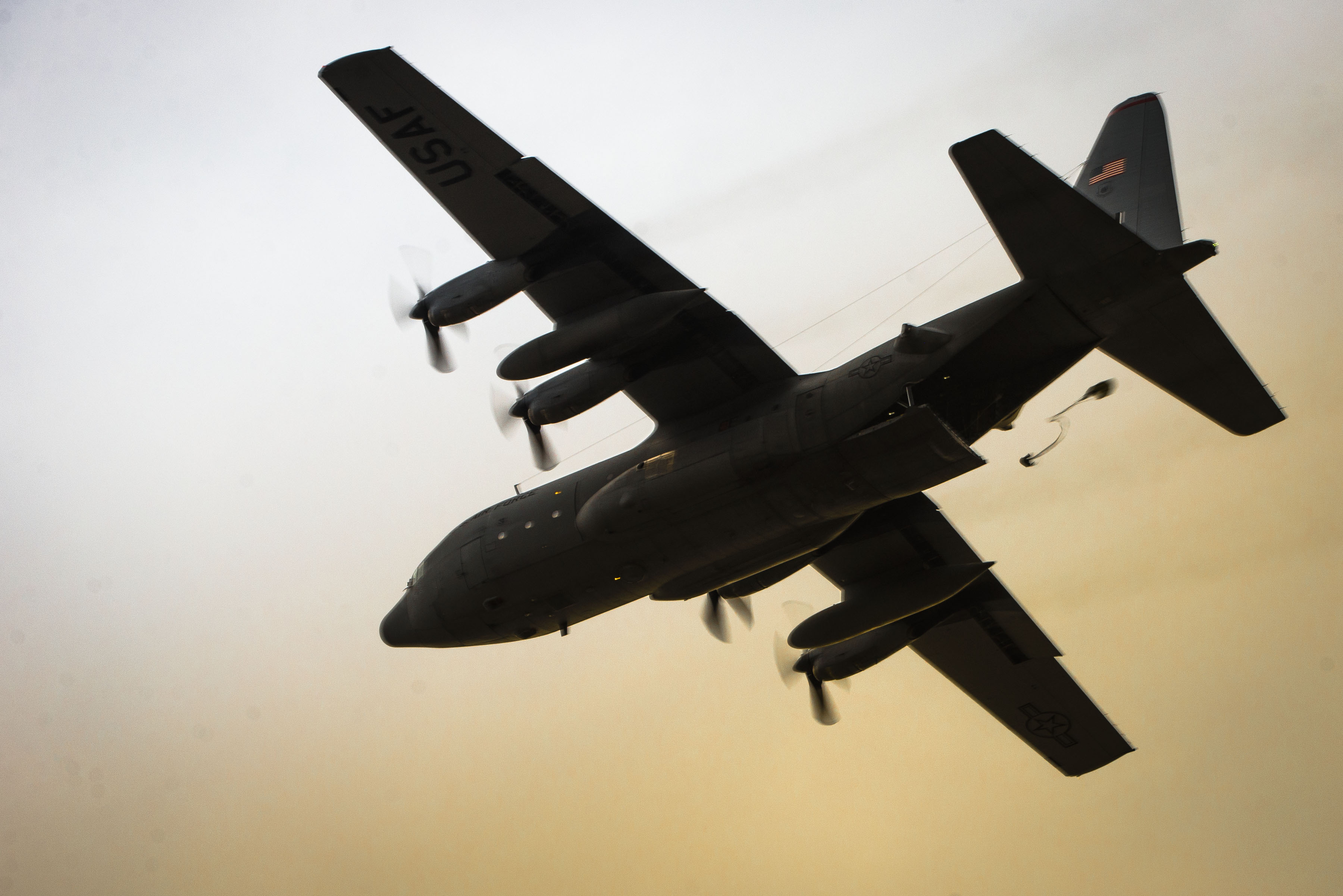YOKOTA AIR BASE, Japan -- A training sandbag flies from the back of a U.S. Air Force C-130 Hercules at Yokota Air Base, Japan, Feb. 21, 2013. C-130 aircrews with the 36th Airlift Squadron demonstrated their airlift capabilities during a readiness week at Yokota. (U.S. Air Force photo by Capt. Raymond Geoffroy)
