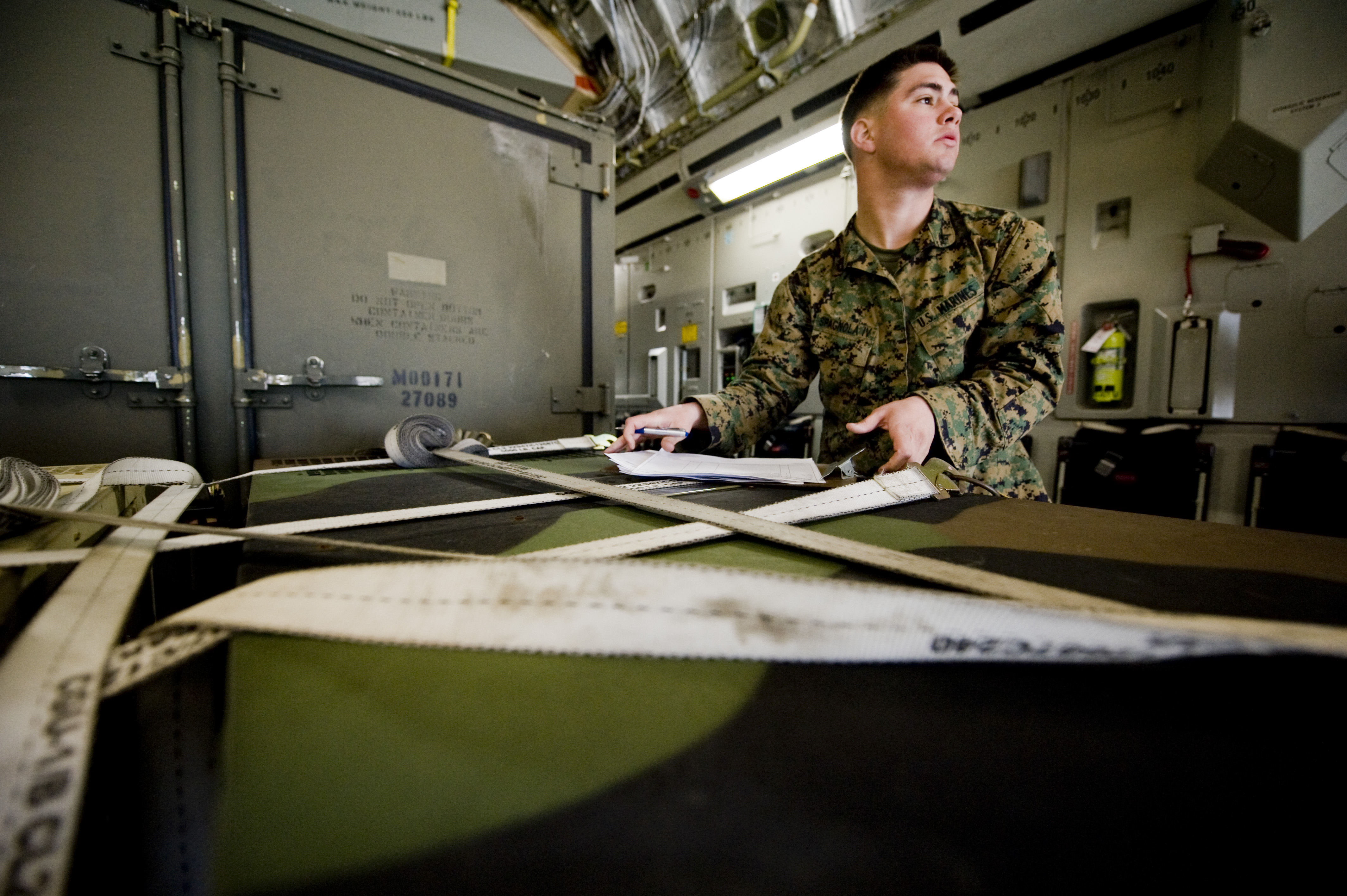 MARINE CORPS AIR STATION IWAKUNI, Japan -- U.S. Marines Corps Lance Cpl. Anthony Spangnola IV, checks a cargo manifest on board a C-17 Globemaster III March 25, 2011. The C-17 crew flew into Marine Corps Air Station Iwakuni to pick up Marines from Marine Wing Support Squadron 171 and drop them off at Sendai Airport. The Marines travelled to Sendai Airport to setup portable showers for Japanese citizens as part of the humanitarian assistance provided during Operation Tomodachi. (U.S. Air Force photo/Staff Sgt. Jonathan Steffen)