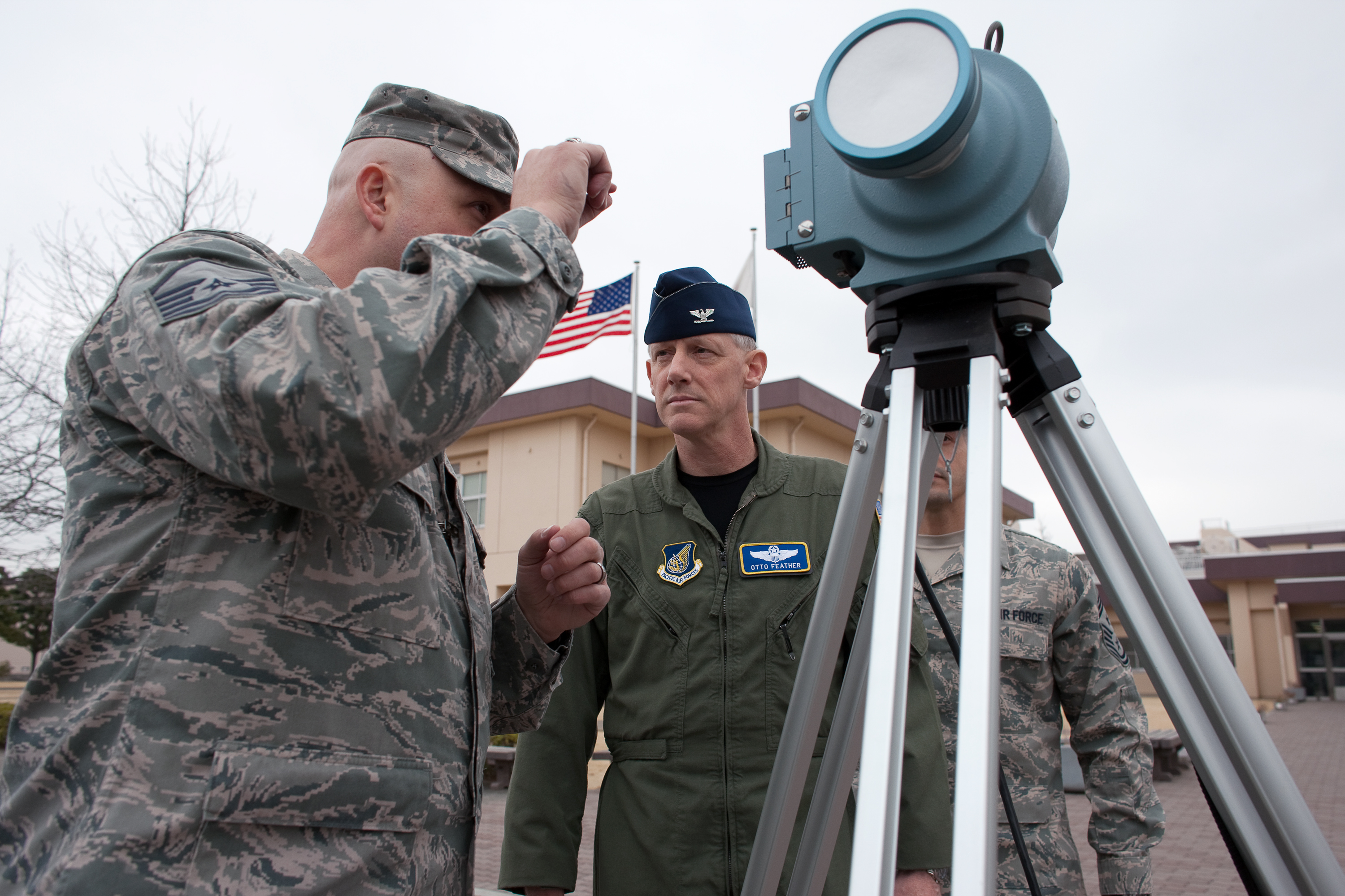 YOKOTA AIR BASE, Japan -- Master Sgt. James Mings (left), 374th Aerospace Medicine Squadron bioenvironmental engineer, explains the procedure for taking air samples to monitor for radiation to Col. Otto Feather (right), 374th Airlift Wing commander, here March 15. Air monitoring is conducted every hour to ensure the safety of base residents. (U.S. Air Force photo/Osakabe Yasuo)