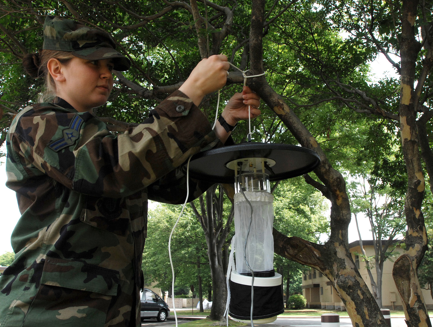 Airman 1st Class Lori Capps, 374th Aerospace Medicine Squadron, sets up traps to catch Mosquito?s through out the season, and send them off to Camp Zama, where they will be tested at the USA Chippm testing facility. (Photo by Airman 1st Class Laszlo Babocsi)