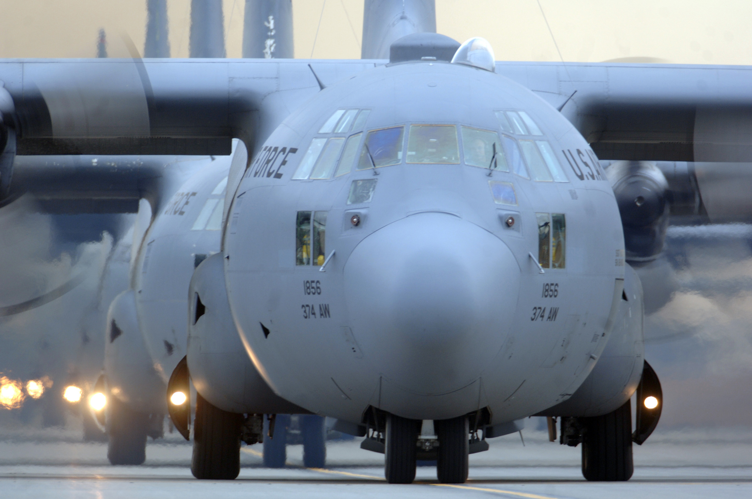 YOKOTA AIR BASE, Japan (AFPN) -- C-130 Hercules aircraft from the 36th Airlift Squadron taxi out for a mission during a six-ship sortie. The squadron is the only forward-based tactical airlift squadron in the Pacific region. They provide C-130 aircrews to conduct theater airlift, special operations, aeromedical evacuation, search and rescue, repatriation and humanitarian relief missions. (U.S. Air Force photo by Master Sgt. Val Gempis)