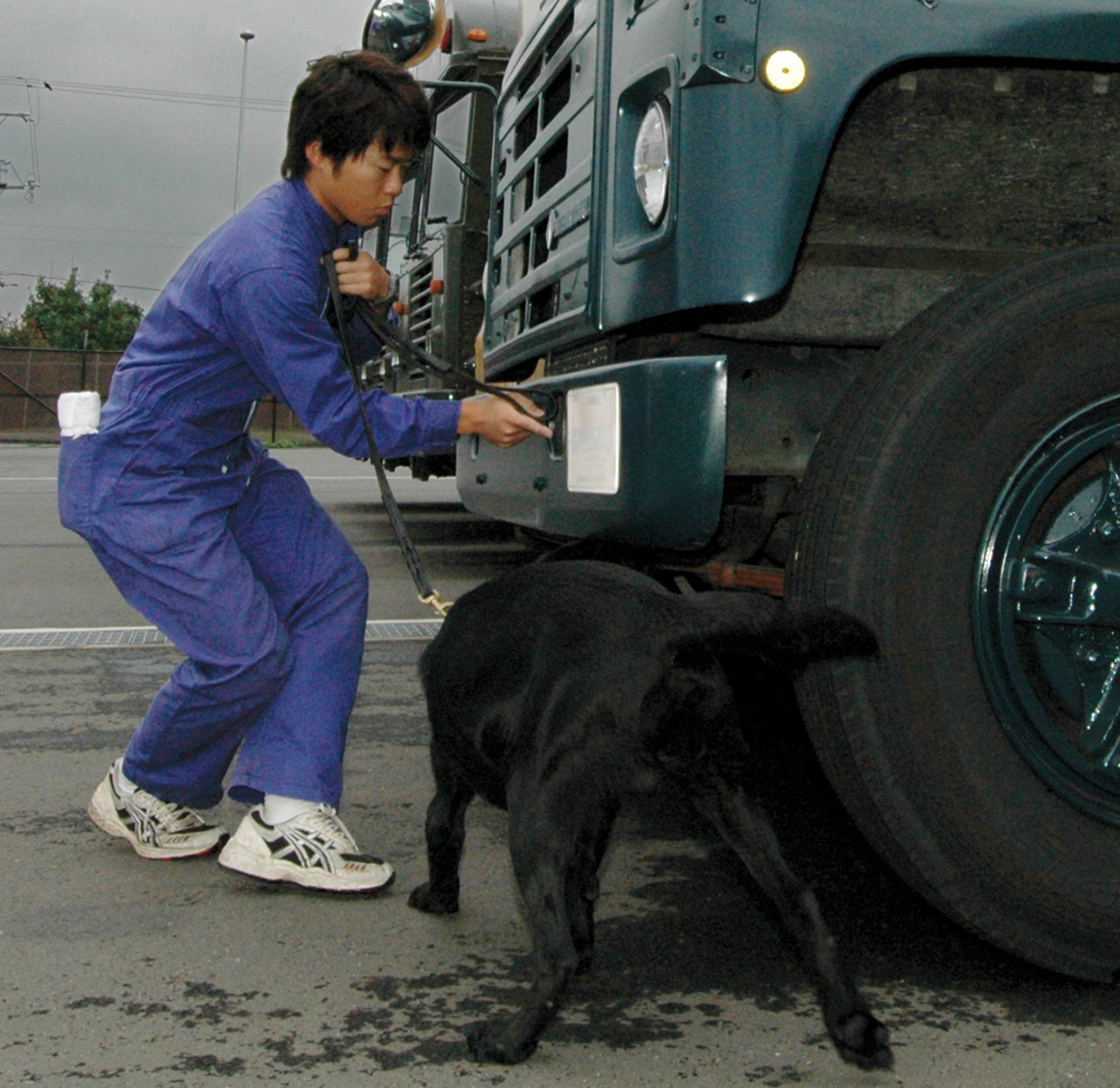 YOKOTA AIR BASE, Japan -- Japanese customs agent Okawar Tadashi checks the outside of a bus with his dog, Spark, trying to find hidden explosives. Mr. Tadashi and other customs agents are participating in a joint training exercise -- established six years ago to build relations and expertise among the teams -- with Yokota military working dog handlers. Their task is to find hidden explosives on any bus, (U.S. Air Force photo by Staff Sgt. Karen J. Tomasik)