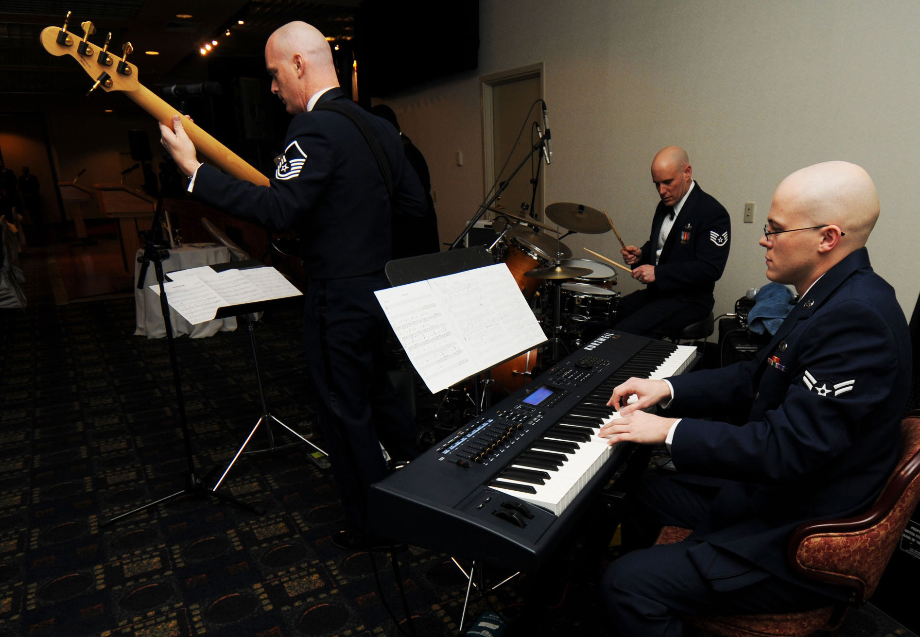 YOKOTA AIR BASE, Japan -- Airman 1st Class Adam Sims, 374th Airlift Wing Public Affairs combat correspondent, plays the keyboard Feb. 21 during the 374th AW Annual Awards Ceremony at the enlisted club. (U.S. Air Force photo/Senior Airman Veronica Pierce)