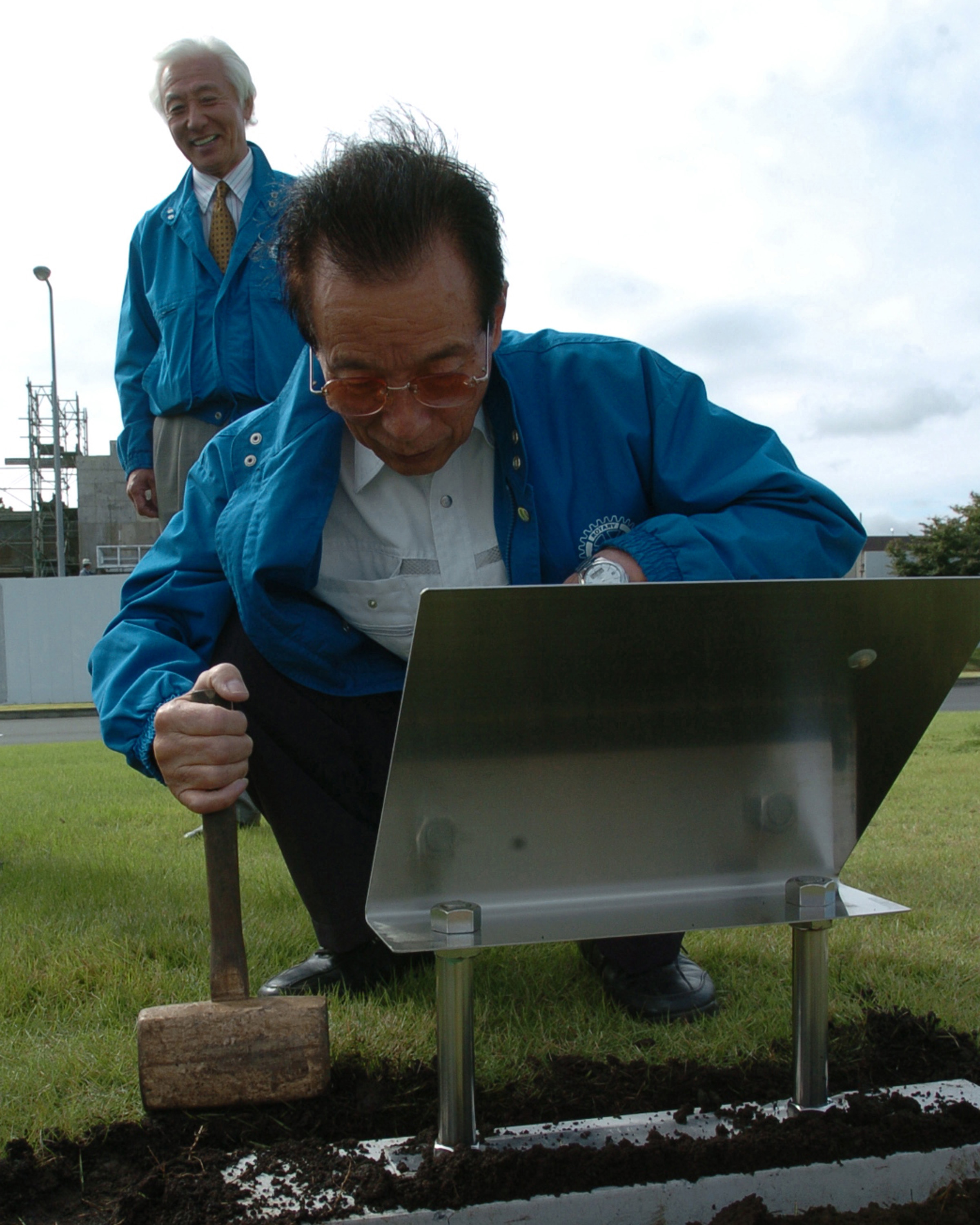 Akio Takahashi pats down dirt around a newly donated plaque Oct. 4 at the Samurai Training Grounds at Yokota Air Base. The plaque along with the donation of three trees was used to commemorate the Rotary Club's 14 year anniversary.(U.S. Air Force photo by Airman Sean Martin)