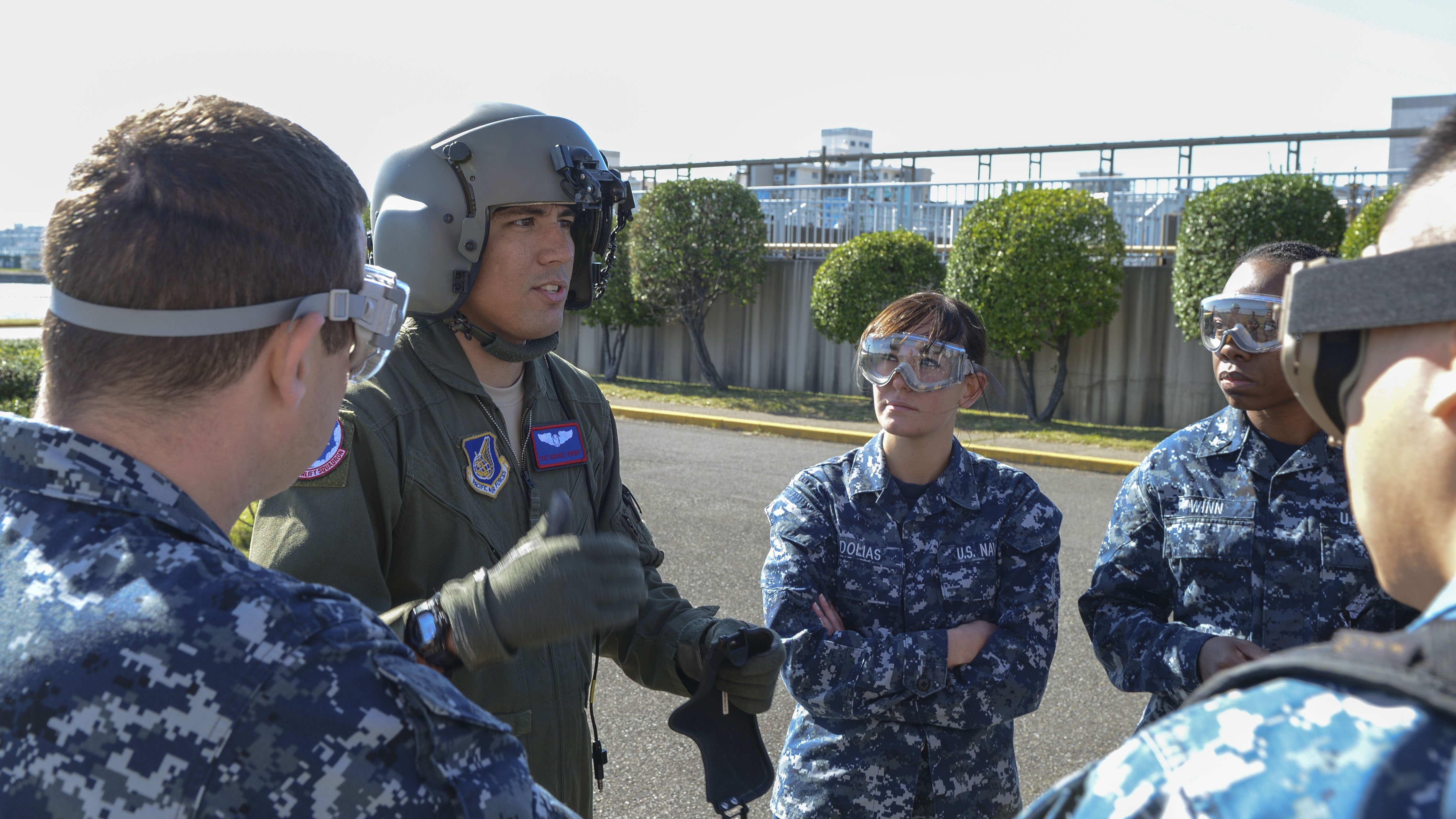 Staff Sgt. Michael Wright, 459th Airlift Squadron flight engineer, briefs a group of seaman on aeromedical evacuation using the UH-1N Huey during Exercise Keen Sword 2015 at Yokosuka Naval Station, Japan, Nov. 13, 2014. Approximately 11,000 U.S. personnel participated in the latest chapter of Keen Sword, including members from multiple branches of service. (U.S. Air Force photo by Airman 1st Class Soo C. Kim/Released)