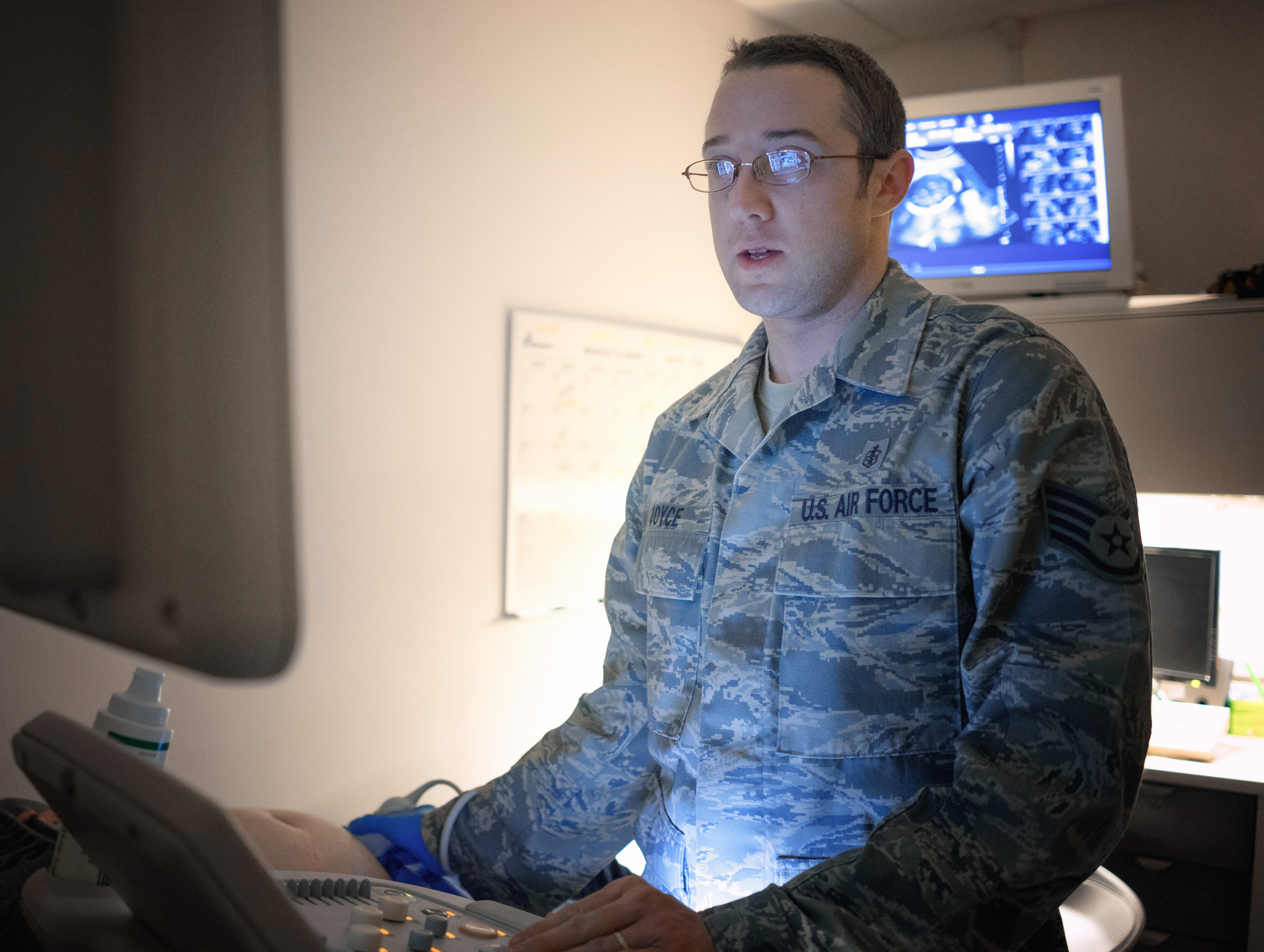 Staff Sgt. Brandon Joyce, 374th Medical Support Squadron surgical services NCO in charge of sonography, performs an ultrasound, Feb. 11, 2016, at Yokota Air Base, Japan. Ultrasound can be used to see internal body structures such as tendons and muscles. (U.S. Air Force photo by Airman 1st Class Delano Scott/Released)