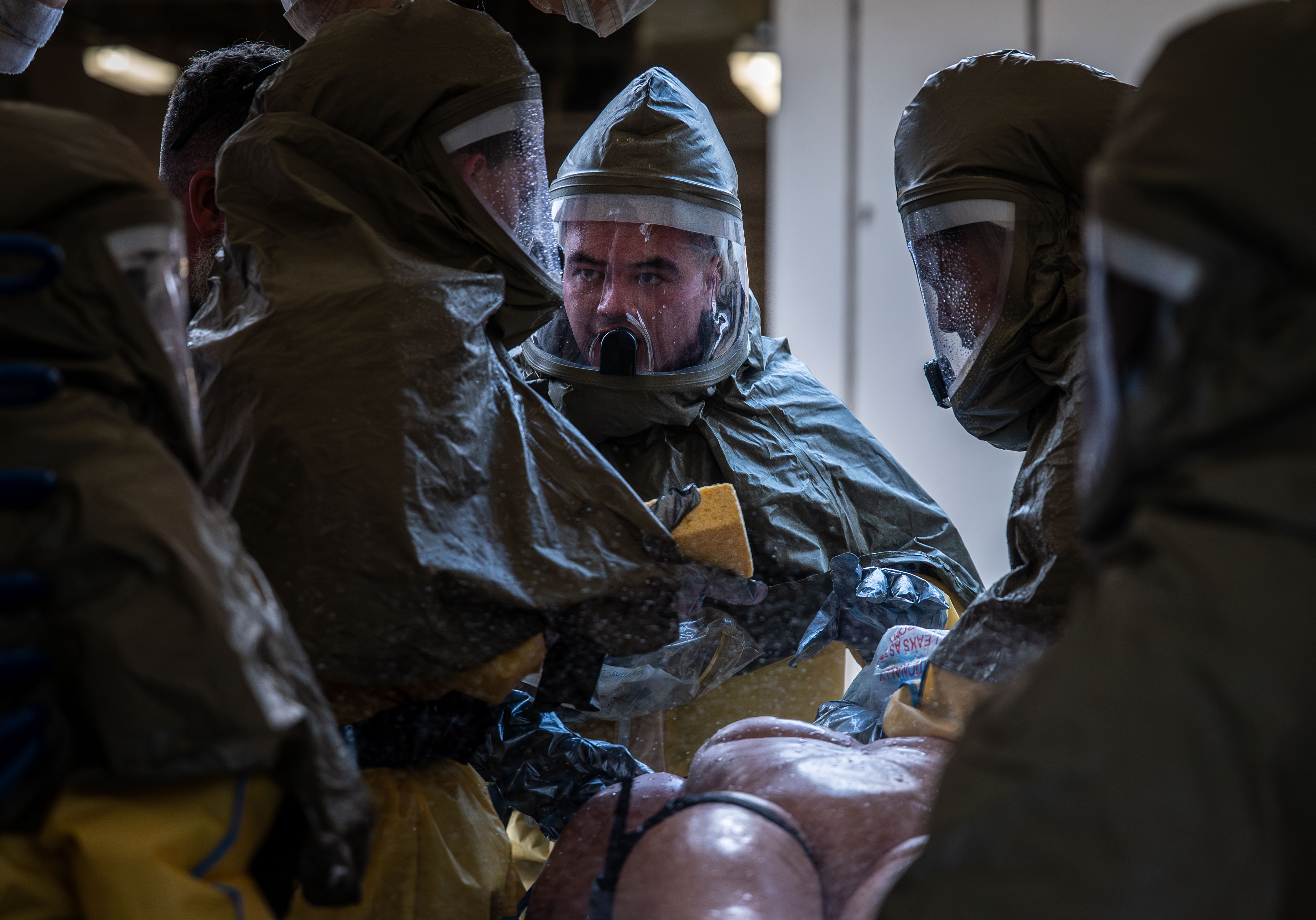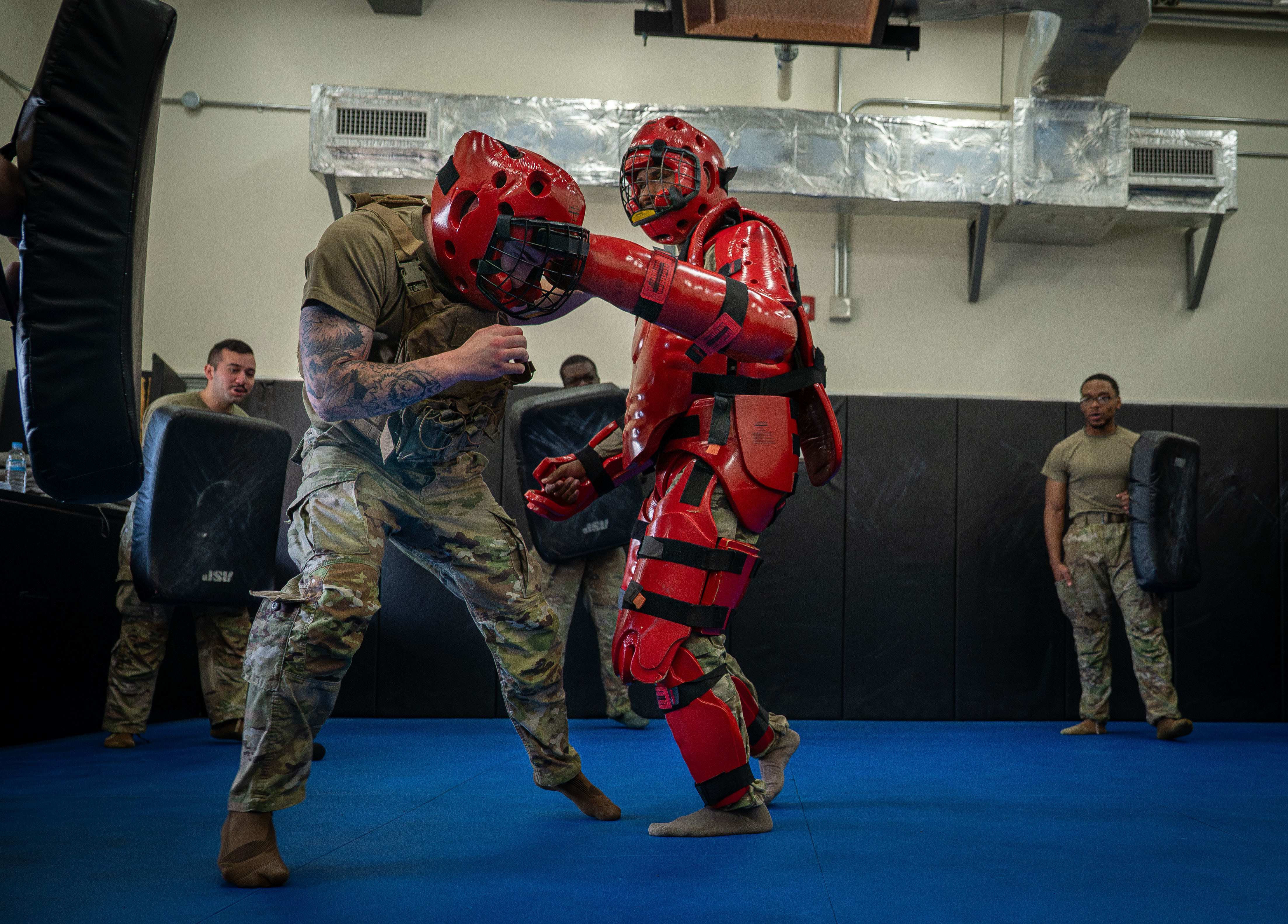 From the left, U.S. Air Force Airman 1st Class Kalaia Davis, 730th Air Mobility Squadron passenger service agent, and Senior Airman Dorrean Starks, 374th Security Forces Squadron basic combative instructor, engage in combative training at Yokota Air Base, Japan, Oct. 10, 2025. Airmen were given the opportunity to engage with the red man suit, training on combative techniques that enhance their ability to respond to real-world threats. (U.S. Air Force photo by Airman 1st Class Kayla Karelas)