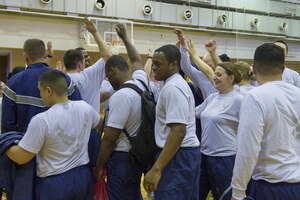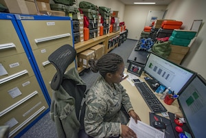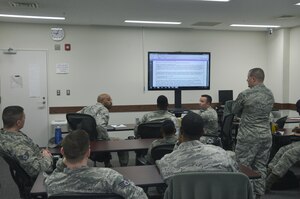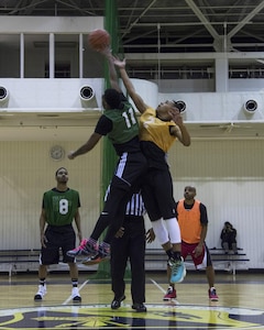 Jarvis Hodges, 374th Maintenance Squadron, taps the ball to a teammate over Austin Ludden, 374th Communications Squadron, at the beginning of an intramural basketball game at Yokota Air Base, Japan, Jan. 24, 2017. The 374 MXS team won the game 46-40 giving them a 1-0 record for the season. (U.S. Air