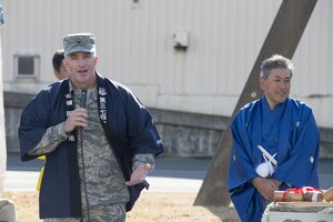 Staff Sgt. David Owsianka, 374th Airlift Wing public affairs photojournalist, dons Mission-Oriented Protective Posture gear during a Samurai Readiness Training Day at Yokota Air Base, Japan, Jan. 23, 2017. Airmen must quickly and correctly don MOPP gear. (U.S. Air Force photo by Yasuo Osakabe)