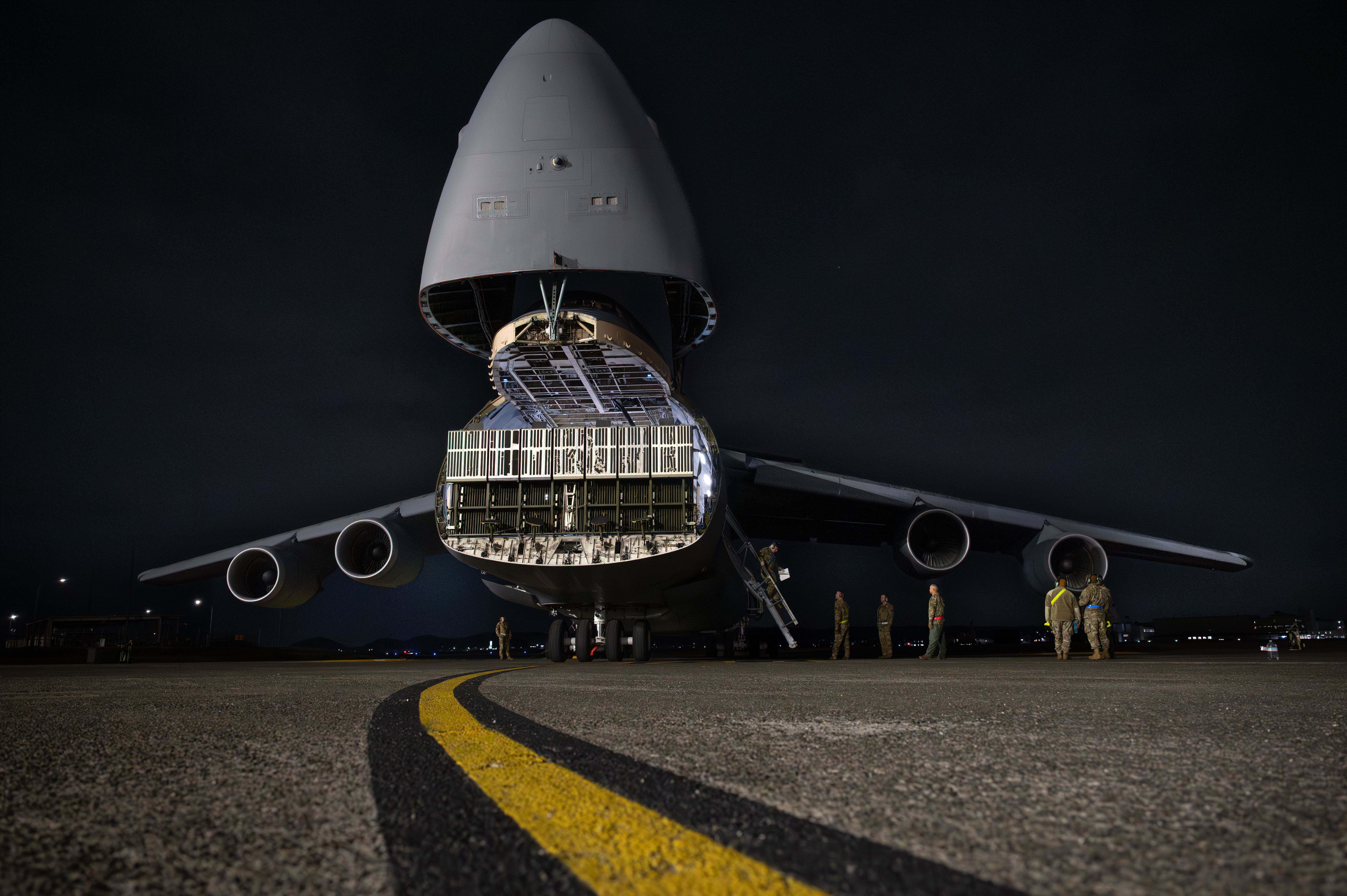 U.S. Air Force Airmen from the 730th Air Mobility Squadron and the 22nd Airlift Squadron from Travis Air Force Base, Calif., load UH-1N Hueys on to a C-5M Super Galaxy assigned to the 22nd AS at Yokota Air Base, Japan, Dec. 3, 2025. The Huey has supported Yokota since 1980, and its retirement aligns with the Air Force's effort to modernize rotary-wing capabilities to meet today's operational demands.